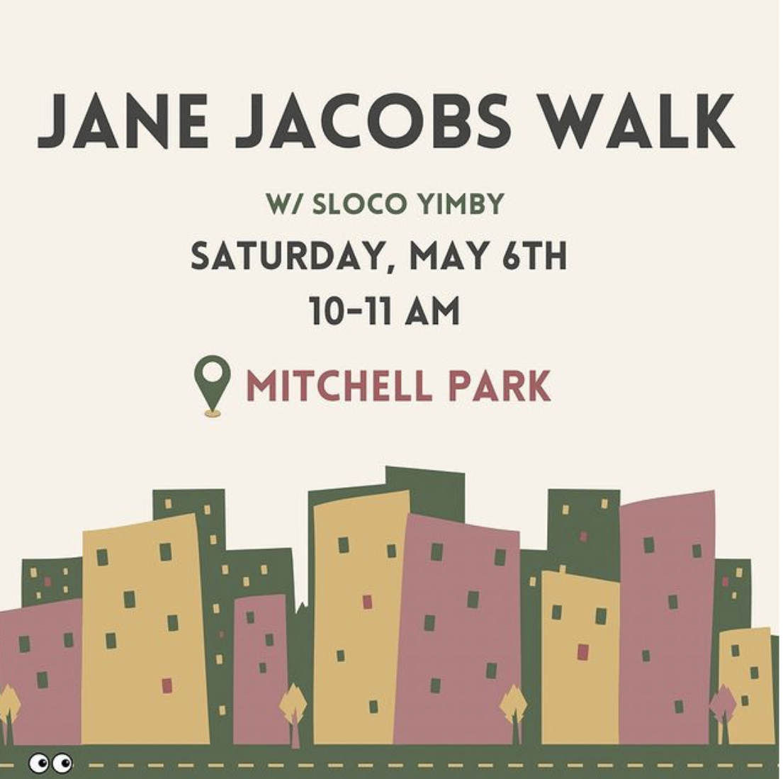 Cal Poly Urbanists and SLOCO Yimby are partnering to host a neighborhood walk around Mitchell Park. We are celebrating the influential journalist, author, activist, and urban theorist’s birthday by walking around the neighborhoods of SLO, discussing bike lanes, ADUs, city planning, and more!
