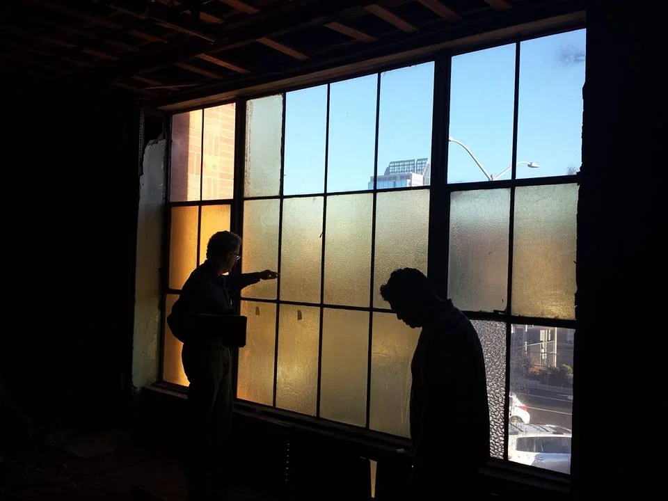 photo: Preservation Sacramento- The two windows with tape on them are new windows, test samples installed to compare with the old windows to see which worked best as a replacement for lost panes in the depot's windows.